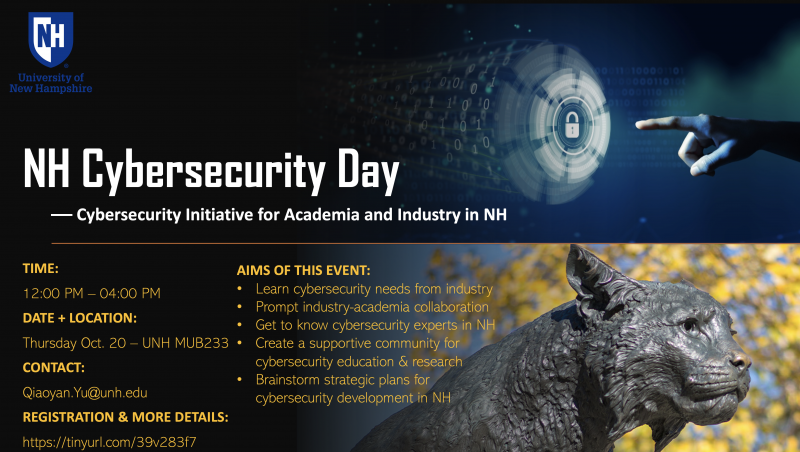 October 20, 2022 We will host the first New Hampshire Cybersecurity Day at UNH Durham campus on Oct. 20, 2022. TIME: 12:00 PM – 04:00 PM LOCATION: Memorial Union Building Room 233 (Address: 83 Main St, Durham, NH 03824) Registration link is as below: https://tinyurl.com/4w8rhkep
